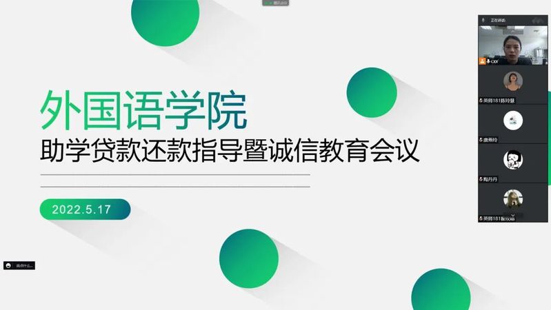 5月17日,69视频 召开助学贷款还款指导暨诚信教育线上会议,学院党委副书记、副院长陈俊怀,学工办主任王媛媛出席会议,学院对接学生资助工作辅导员陈习主持会议,2022届全体贷款毕业生参会。