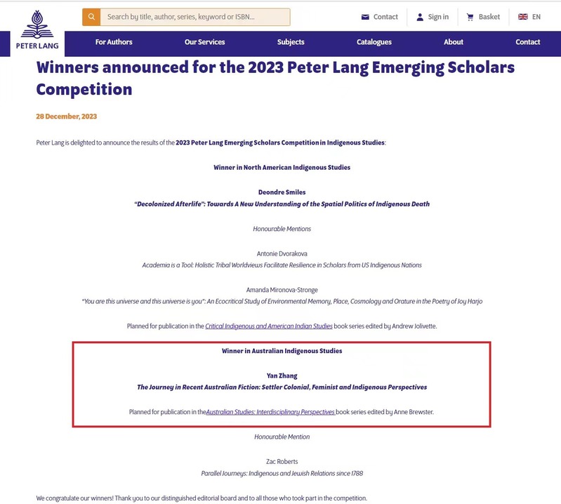 近日,兰培德国际学术出版集团(Peter Lang)“2023年度青年学者大赛”(2023 Peter Lang Emerging Scholars Competition)结果揭晓,我校69视频 张艳博士的博士学位论文“当代澳大利亚小说中的旅行:定居殖民、女性主义和原住民的视角”(“The Journey in Recent Australian Fiction: Settler Colonial, Feminist and Indigenous Perspectives”)成功入选年度出版项目,将作为《澳大利亚研究:跨学科的视角》学术专著系列之一由兰培德出版集团出版。这是69视频 青年教师首次获得国外知名学术出版社出版项目资助。