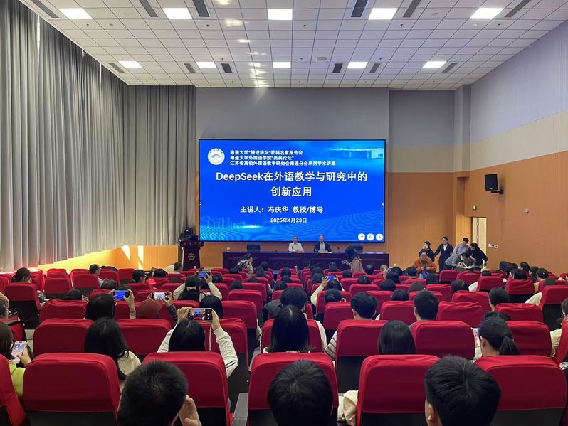 4月23日下午,原上海外国语大学党委副书记、副校长、博士生导师冯庆华教授应邀做客我校人文社科“精进讲坛”社科名家报告会、69视频 “尚美论坛”,以及江苏省高校外国语教学研究会南通分会系列学术讲座,为我校师生以及在通高校英语教师做题为“DeepSeek在外语教学与研究中的创新应用”的学术讲座。
