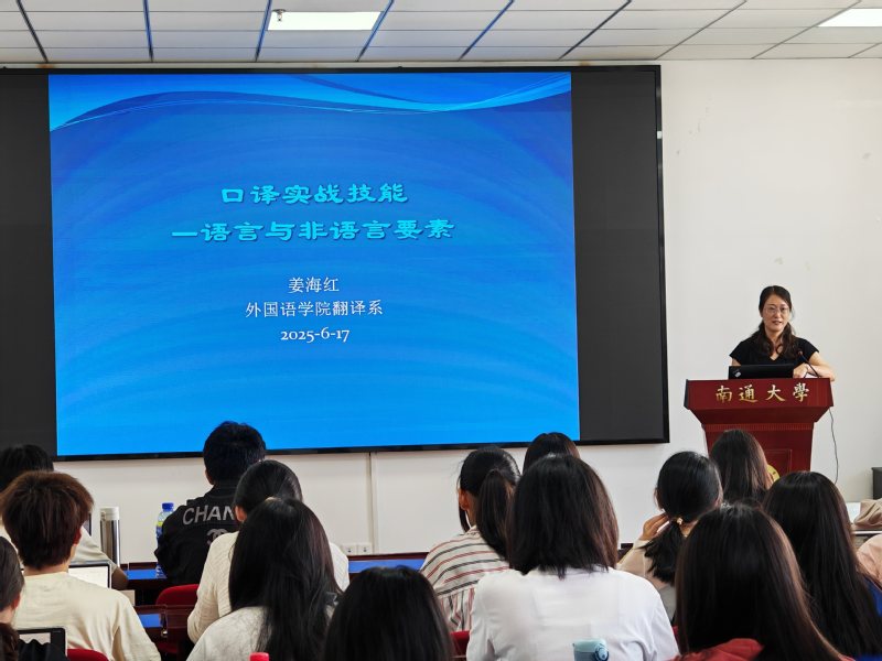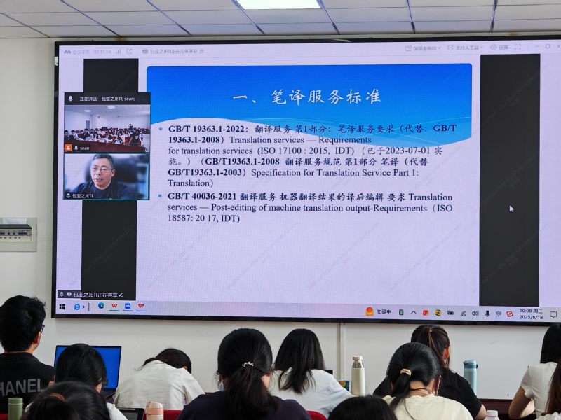 见习首日,姜海红老师以“口译能力发展” 课程开启活动序幕。课堂上,姜老师深入剖析语言与非语言要素在口译实战中的关键作用,并结合地铁标识翻译案例,引导学生思考现实工作场景中的实际问题,让学生们直观感受到翻译工作与生活场景的紧密联系。紧接着,周邦友老师聚焦 “笔译质量管理”,详细讲解如何规避欧式中文和中式英语,着重强调忠实度与流畅度是衡量翻译质量的重要标准,两位老师的课程为学生点明了人工智能时代翻译能力发展中 “守正” 的重要性。