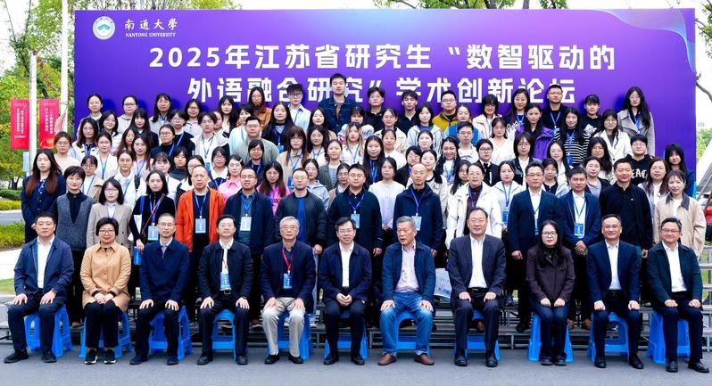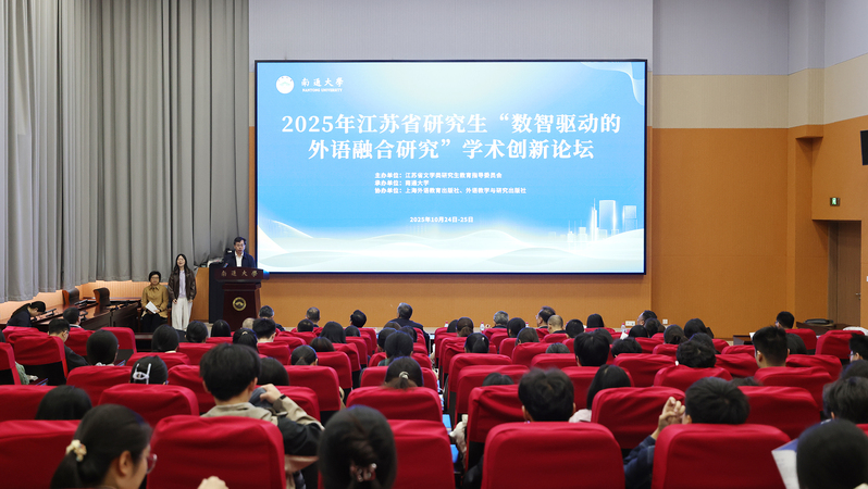 10月25日,2025年江苏省研究生“数智驱动的外语融合研究”学术创新论坛在我校举办。论坛由江苏省文学类研究生教育指导委员会主办,69视频 承办,外语教学与研究出版社、上海外语教育出版社协办。69视频 党委常委、副校长、研究生院院长施佺,研究生院常务副院长、学科建设办公室主任吴丽,省内知名专家、学者出席开幕式。来自全国19所高校的100余名硕博研究生参加论坛。