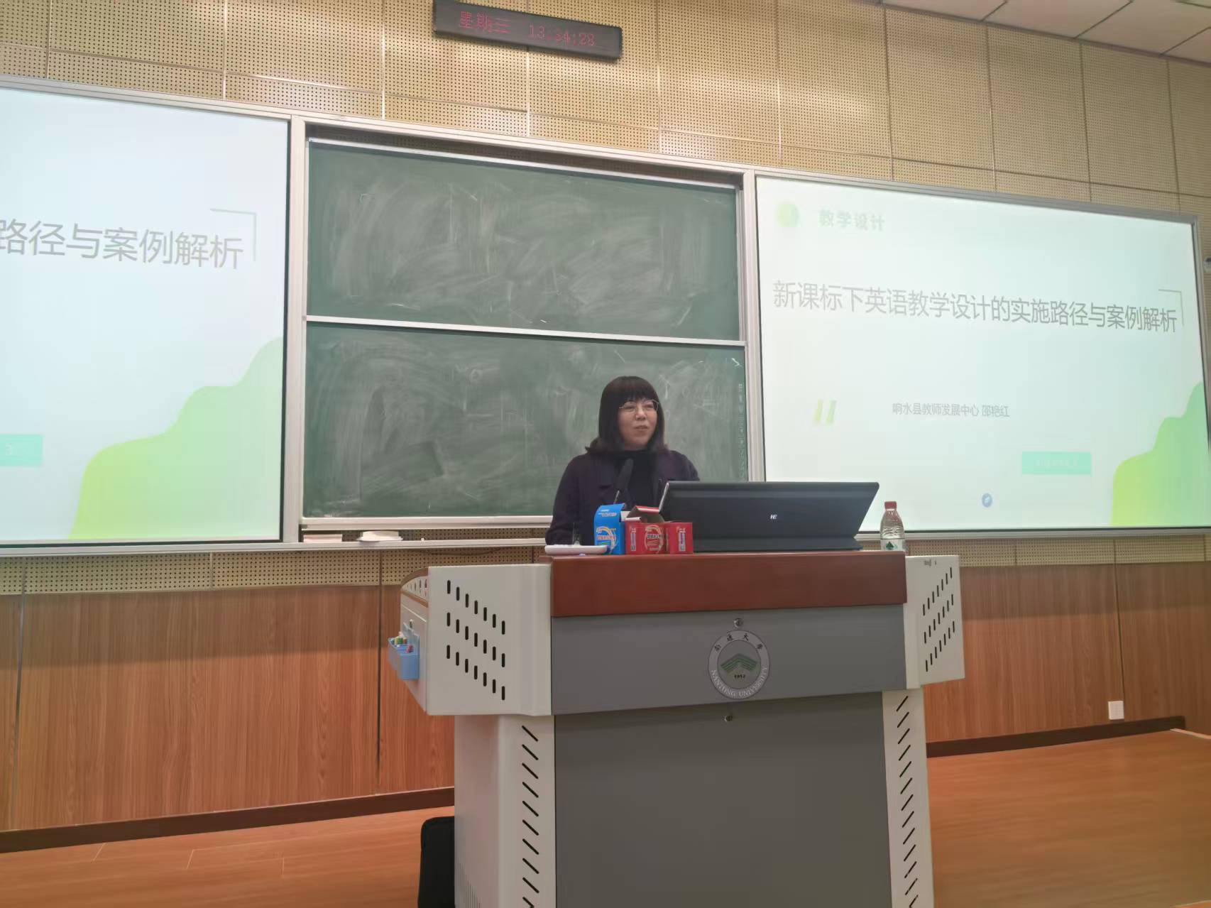 为深化高校与中学协同育人机制,助力英语师范专业师生精准把握基础教育英语课程改革前沿动态,12 月 3 日,响水县教师发展中心资深教研员邵艳红博士应邀做客69视频 ,以 “英语新课标与教学设计” 为题开展专题讲座。本次讲座是学院 “中学名师进课堂” 系列活动的重要组成部分,由69视频 副院长王雪玉主持,英语师范专业全体师生及部分研究生共同参与。